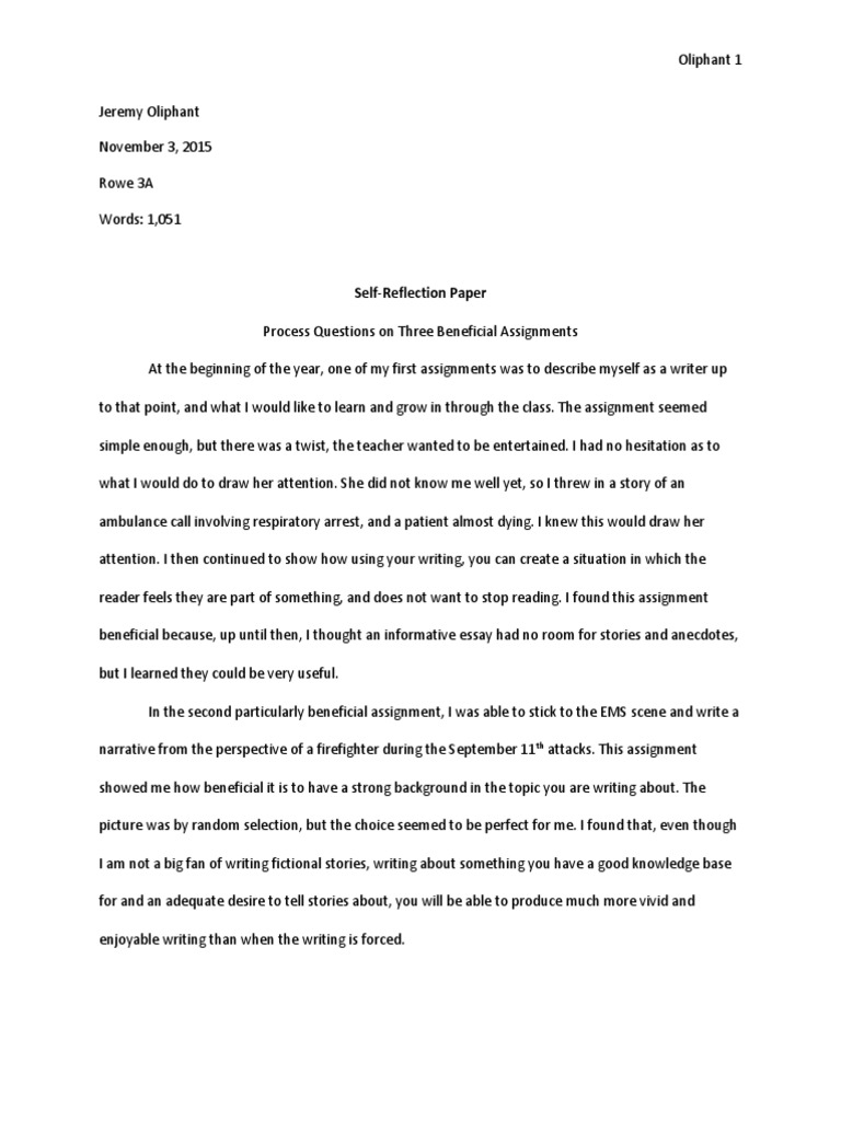Since it's about yourself, you already have a topic to write about. A short summary of this paper. Essay samples on self reflection the individual reflection on the presence in class we live in an age where people are constantly focusing on numbers and data, but what is always overlooked is the impact philosophy has in our day to day lives. Self reflection paper on leadership. A reflective essay is a type of written work which reflects your own self. I have found myself, like many others, curious about who i am and how i became that way. Every decision, action, and event have multiple consequences, including undesirable effects. Adding them to the thesis statement and your paper gives the reflective essay an extra dimension, creates depth, and intrigue. To do this, you may reflect on emotions, memories, and feelings you've experienced at that time. Hence, this type of essay stands out from other forms. Self reflection paper 1489 words | 6 pages. What should be in the body paragraphs of a self reflective essay? Self reflection paper example apa format.
